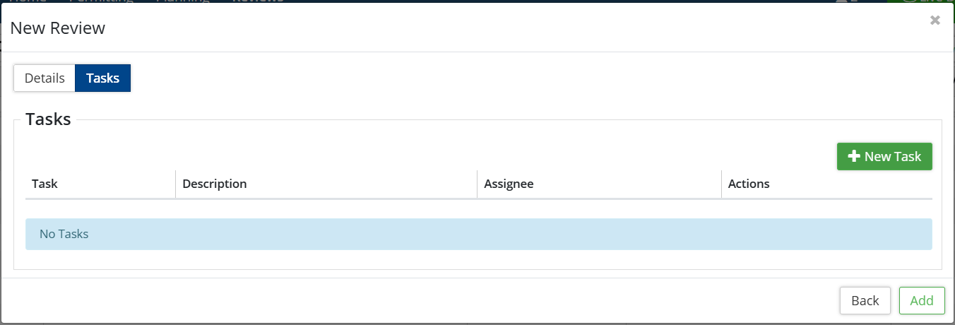 Click Next. The Tasks tab is now selected, where the actionable tasks associated with the Review are to be added: