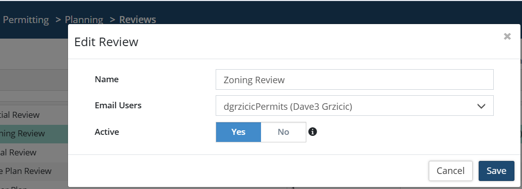 Navigate to Home > Permitting > Planning (Manage Section) > Reviews: