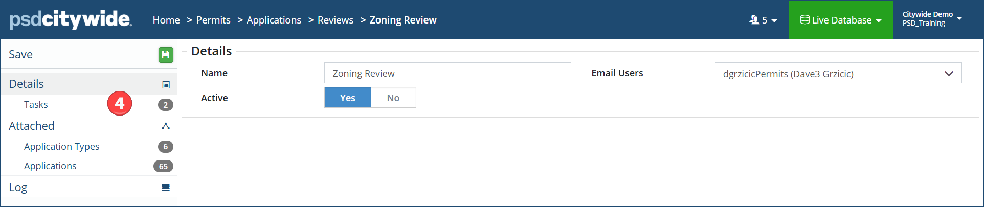 Ensure the Active flag ❹ is set to Yes. If set to No, the Review will not be available in the system. “No” might be the setting for a new Review to be used some time in the future, or it could be the setting for an existing Review that is no longer used (but not deleted, so that data pertaining to it is retained in the system).