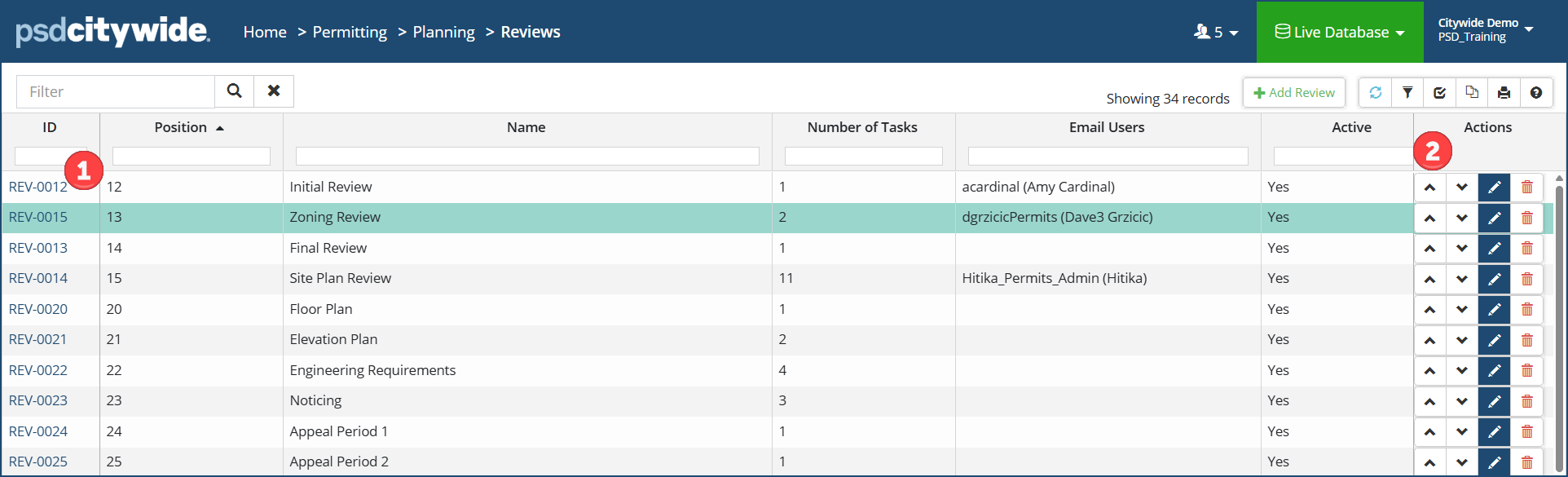 The ID ❶column contains the auto-generated Review ID, each of which is a link to the detailed Review record. The order of the Reviews can be changed using the up / down arrows ❷ under Actions to suit the flow of the approval process for individual application types. All Review records can be positioned in this manner, placing the most commonly used Reviews nearer to the top of the list.