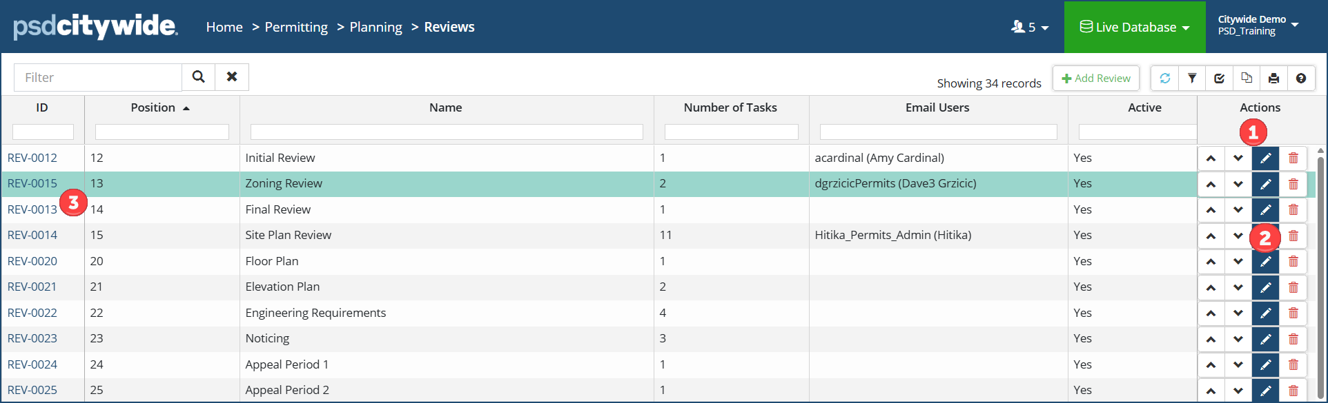 The ID ❶column contains the auto-generated Review ID, each of which is a link to the detailed Review record. The order of the Reviews can be changed using the up / down arrows ❷ under Actions to suit the flow of the approval process for individual application types. All Review records can be positioned in this manner, placing the most commonly used Reviews nearer to the top of the list.