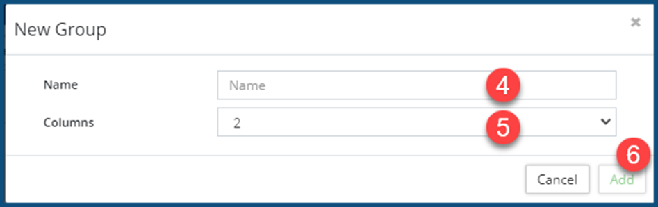 3. Enter a Name for the work field group and the number of columns  (1-4) that the to-be-added fields will occupy. (The columns setting can be changed later, if necessary.)