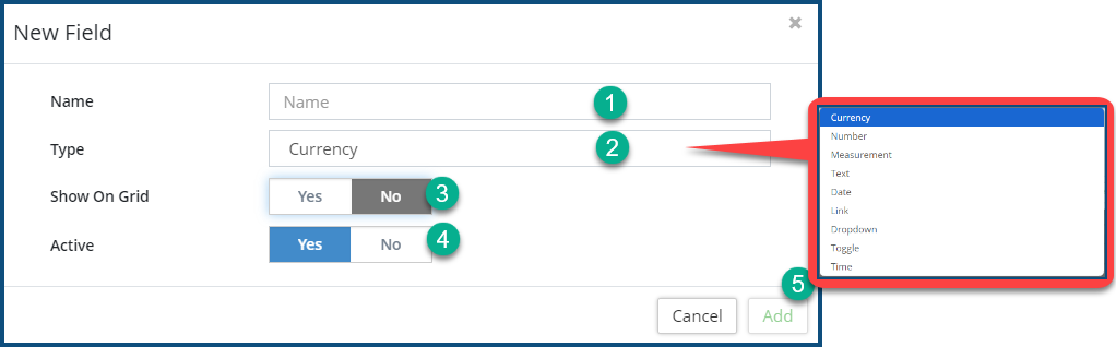 3. Select the field Type  (i.e., number, text, link to an external file, dropdown list of options, etc.). The available field types are defined by your Citywide administrator.