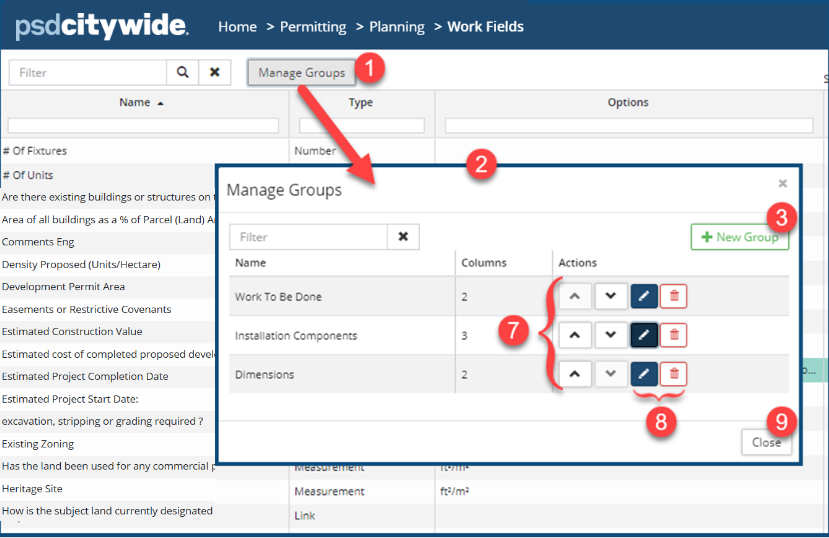 5. Set the order in which the work groups will appear by clicking on the up/down arrows in the row you wish to move. (In the above example, “Dimensions” appears above “Work to be Done.” You may also choose to Edit or Delete a group, as well .