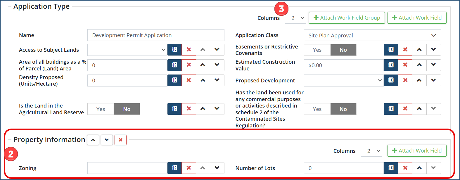 Work field groups are essentially “toolboxes” into which work fields will be placed when applications are being created or modified. Just as electrical tools (wire strippers, voltmeters, etc.) pertain to an electrical project, and plumbing tools (pipe wrenches, drain augers, etc.) pertain to plumbing projects, so, too, different sets of fields apply to different Application types. The particular group of fields in each case will vary according to their relevance and usefulness in defining the Application type. In the example below, all the fields concerned with property details relating to the application are grouped within the Property Information   section.