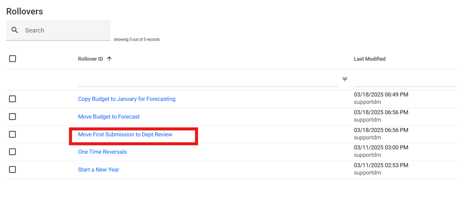 1. For example, there is one called "Move First Submission to Dept Review".  This is set to move all budget data from the 1. First Submission data set to the 2. Department Review data set.