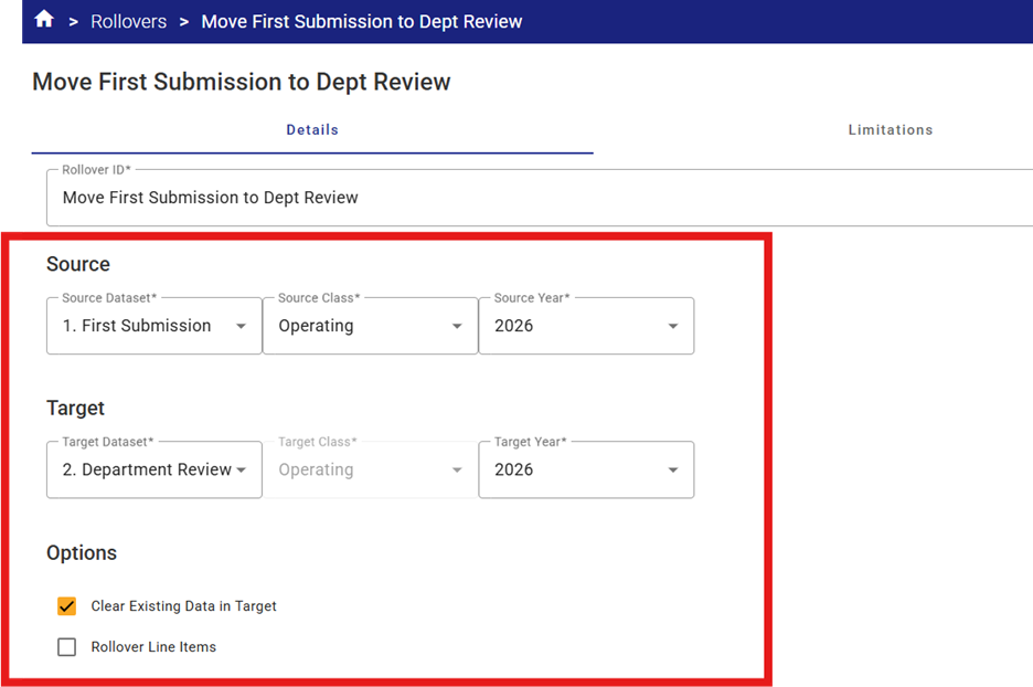 Tip:  When you are satisfied that the Rollover was executed properly, go back to Home > System Administration and add a new Data Set lock for the Source dataset (i.e. 2026 Dept Submission data set in this example) to prevent any accidental edits