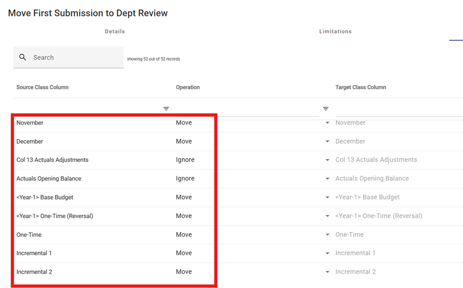 1. Check that the column-function setup is correct on the column tab (what you want is for each of your budget-related columns to be "moved" from the source (First Submission) to the target (Dept. Review), and for all other columns to be ignored.