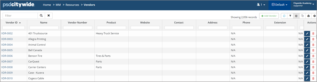 The Vendors screen is used to manage the list of vendors used at the Resource level on Work Orders.