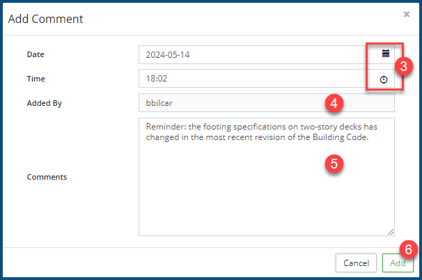 - The Added By ❹ field contains your Citywide login name. It cannot be changed; that is, you cannot attribute a comment you are writing to someone else.