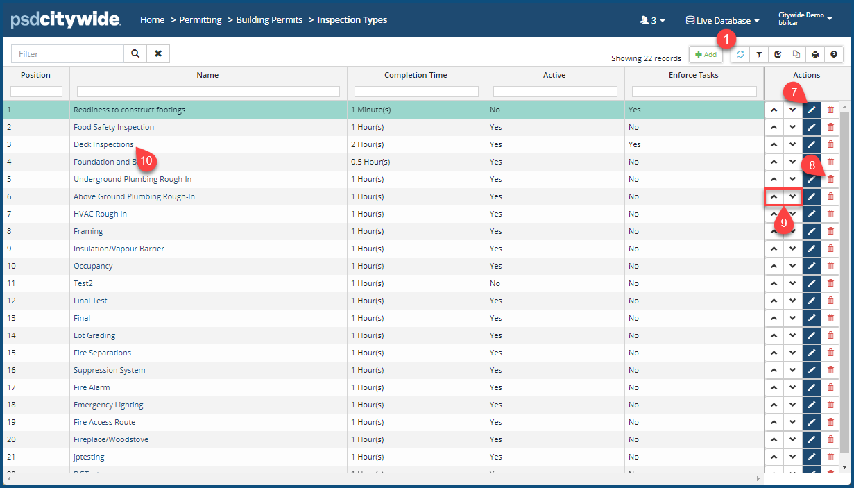 Most Permit applications have a field in which the Inspection Type must be specified. This is the page in which you define the various Inspection Types. When a building permit application is being created, either internally (by municipal staff) or externally (by customers and other types of clients using the the PSDCitywide PortalThe PSDCitywide Portal is an online customer-facing application used to submit Permitting applications. See the PSDCitywide Portal User Guide for details.), the Inspection types created here will appear in a drop-down list attached to the Inspection Type field.