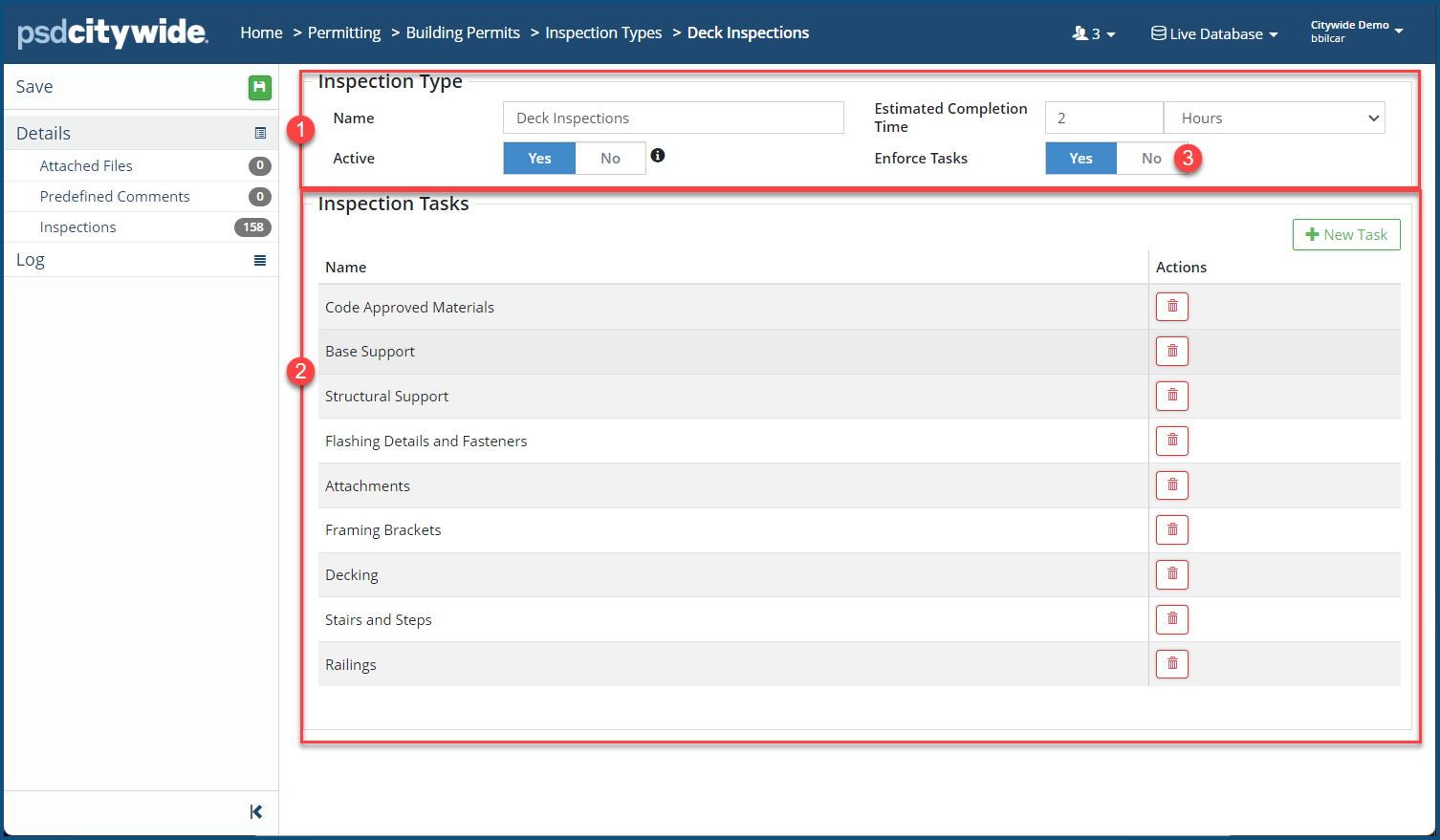 It includes the basic information already entered above pertaining to the Inspection Type ❶ (in this case "Deck Inspections"), as well as a section in which a list of Inspection Tasks ❷ associated with the Inspection Type are enumerated. These are the tasks that can be Enforced ❸ (meaning an inspection must involve all of them) or not.