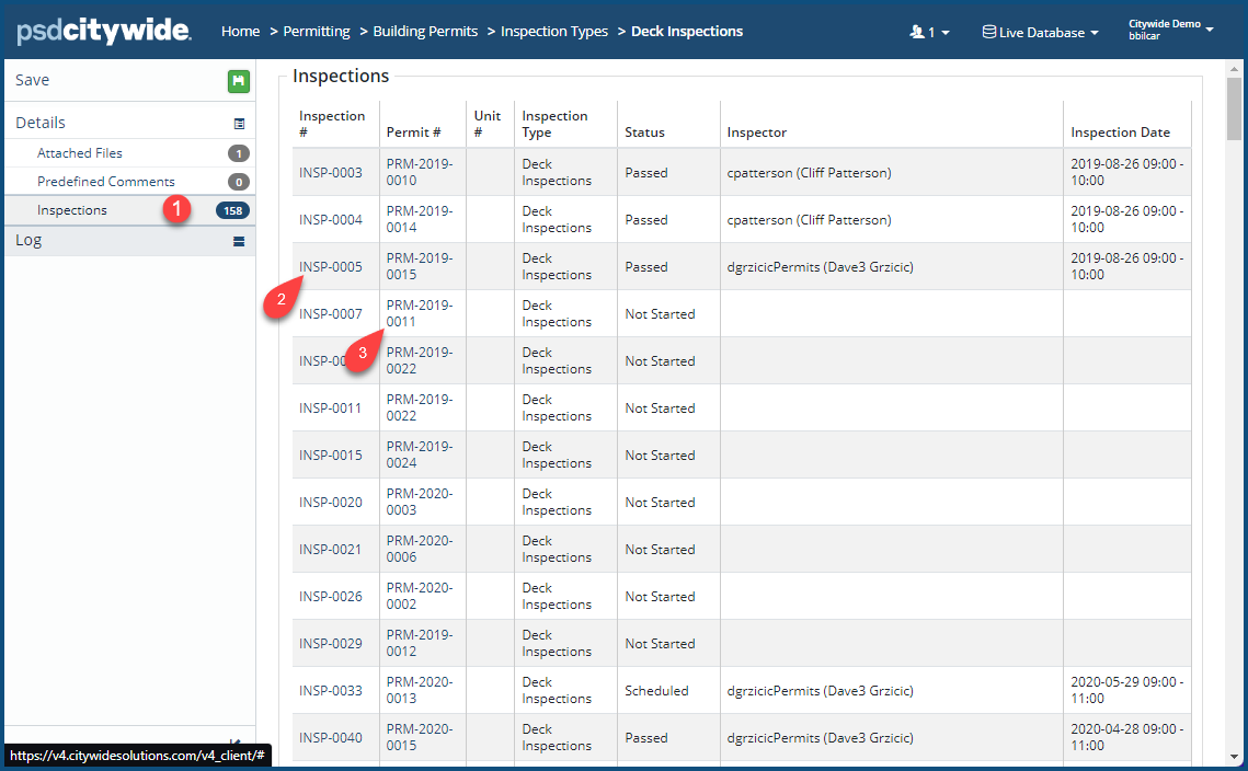 Clicking on the Inspection # link ❷ will open the Inspection record.