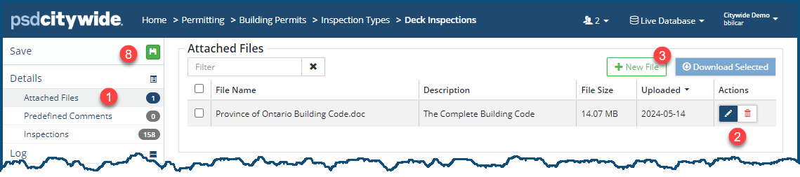 Numerous attachments can be added to an Inspection Type record. These could involve municipal bylaw information, procedural steps in performing an inspection, various technical data sheets, etc.
