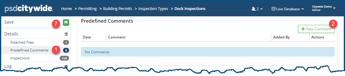 Comments can be added to an Inspection Type. These may be helpful suggestions from colleagues, alerts from management, etc.
