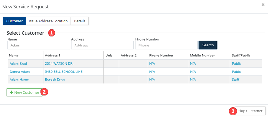 - Search for an existing Customer by Name, Address and/or Phone Number.