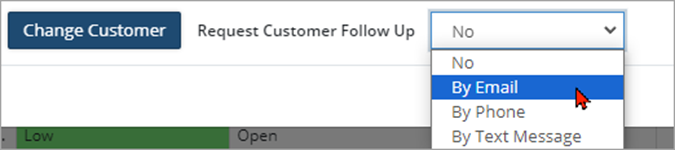 - If follow-up is required, click the Request Customer Follow Up dropdown at the bottom of the wizard and select the appropriate option from the drop-down list.