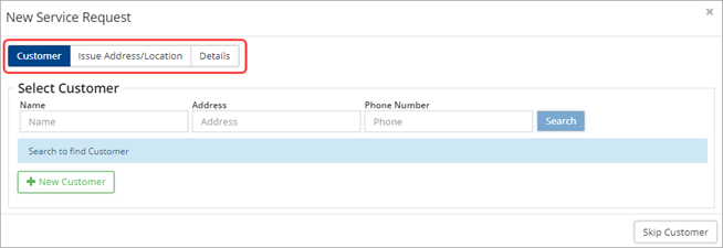 - Add Customer: Customers can be external, that is a member of the community at large; or internal, a staff member within the municipality or town. Three options are available when completing the Customer section of the wizard: