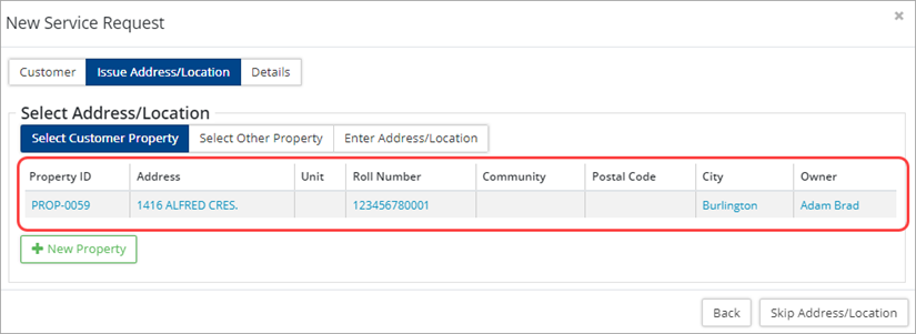 - Select Customer Property: Use this option when the issue address is the customer’s owned/rented property. Click the linked property information displayed in the table.