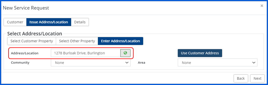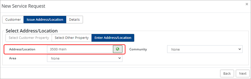 - Enter the Issue Address/Location (i.e., the location where service is required). Options include: