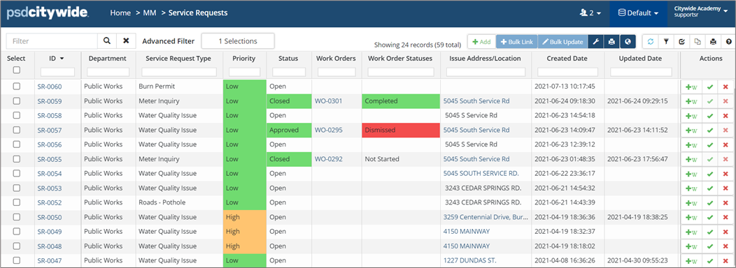 Citywide Maintenance Admins or any user with the appropriate permission level can bulk update SRs. To bulk update SRs: