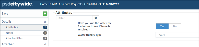 - Fill-in Attribute information as needed. Attributes are specific to the selected SR type and are setup at the Service Request Type Attributes can be setup as toggles, dropdown lists, numbers, time, text fields, etc.