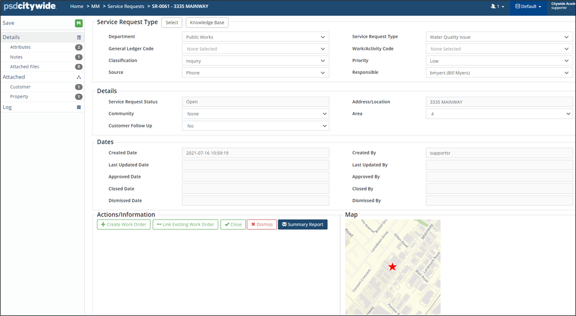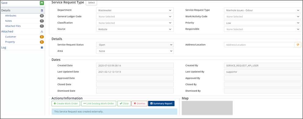 The Details page displays general information related to a service request, such as Service Request Type, Details and Dates. Users with the appropriate permission levels can view and edit fields as needed. Action buttons along the bottom, allow users to Create a new Linked Work Order, Link Existing Work Order, Close, Dismiss or print a Summary Report of the current service request.