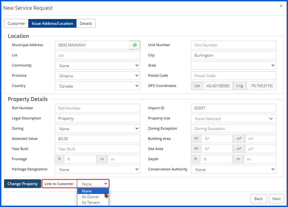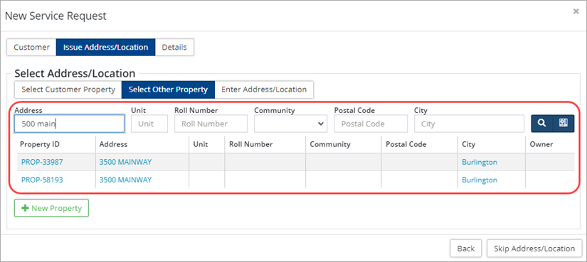 - Select Other Property: Use this option when the issue address is different from the Customer’s address. Search by Address, Unit, Postal Code, Roll Number or City.