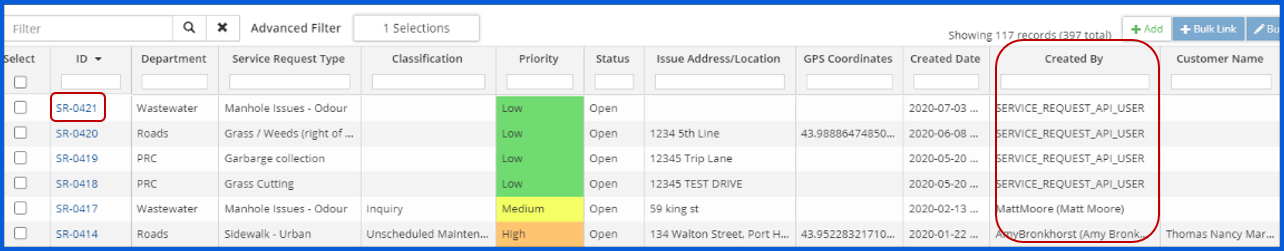 - Filter the grid to show only service requests coming in from the CRP by entering Service_Request_API_User in the Created By