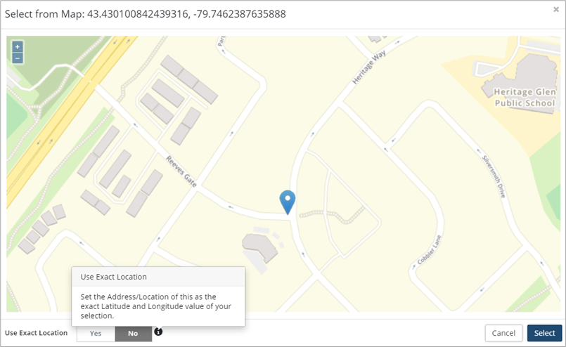 Click on the desired location in the map view. A marker is placed on the closest property address (not the Property itself) as the SR issue location. Click Select to be taken back to the New Service Request wizard. The Address/Location field will populate with the address as selected in the map view. To populate the Address/Location field with the exact coordinates of the marker then toggle Use Exact Location to Yes.
