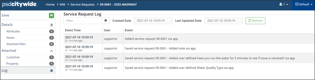 Citywide automatically logs every change made to the database. This section contains all the event data related to the service request (i.e., event time, user, and specific event).