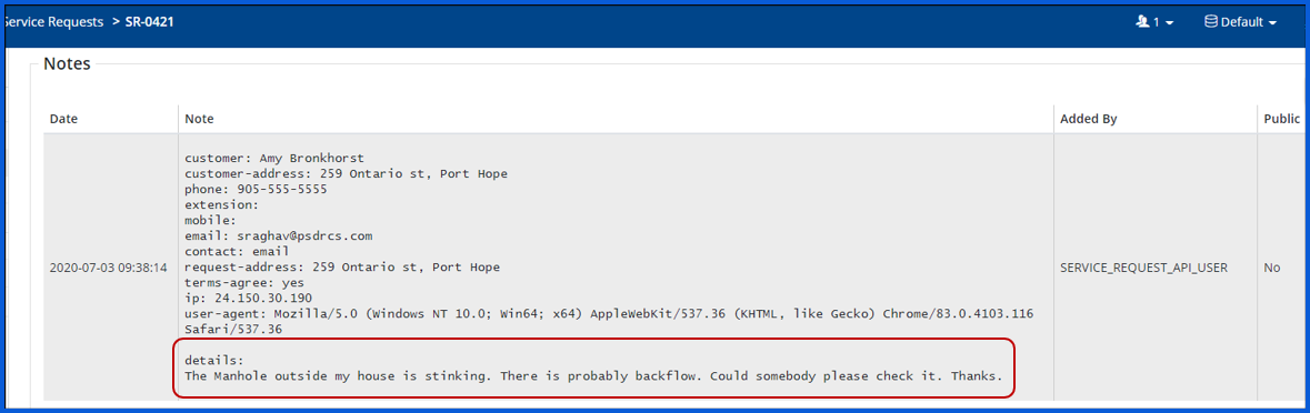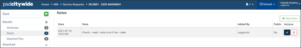 - Click Notes to see the information collected from the CRP portal. A description of the issue as submitted by the citizen is located under Details.