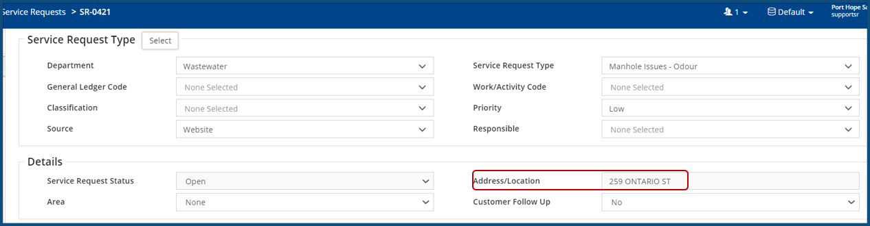 - Click Details in the navigation pane to see the service request Address/Location field updated with the selected property address.