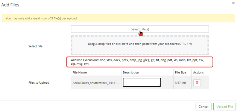 - Click Select File(s) and navigate to the file(s) you would like to upload or simply Drag & Drop files onto the Add Files