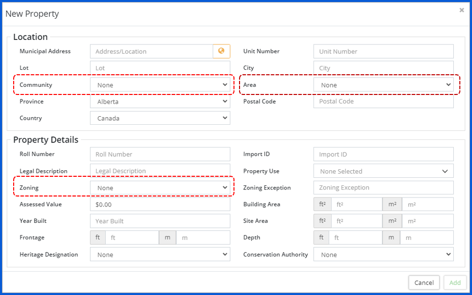 If the property does not exist in the database, click + New Property and enter new property information. Click Add when done.