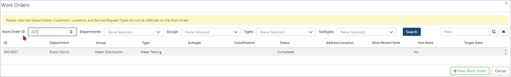 - Search for the WO to be linked to the selected SRs using a work order #, department, etc. All work orders returned in the search will be listed.