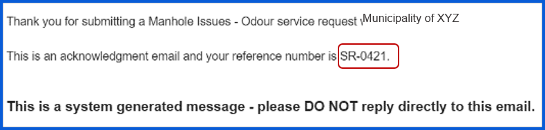 When a customer submits a request on the Citizen Request Portal (CRP), an acknowledgment email is automatically sent to the customer and includes the Service Request ID as a reference number.