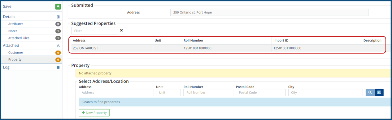 - The Suggested Properties section displays any matching records from the Property data in the database. Select the correct property from the suggested list.
