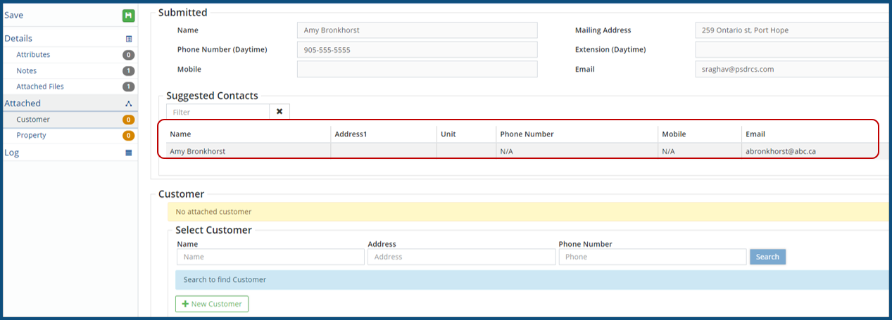 - If the suggested options are incorrect, use the search tool in the Customer section to locate the appropriate contact information. Or click +New Customer and add a new record using the personal details submitted by the citizen.