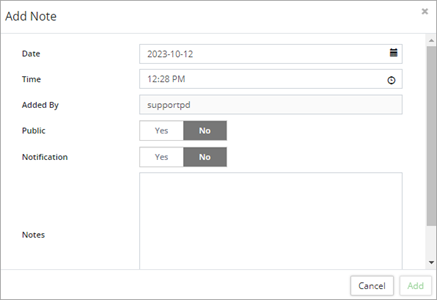 The Notes screen is used to add notes/comments, documenting the history of action taken for the service request. Users with the applicable permissions can edit or delete notes.