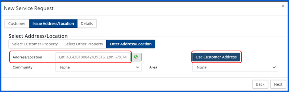 - To use the Customer’s address as the location (not the Property itself) or to select a location close to the Customer’s address on the map, click Use Customer Address.