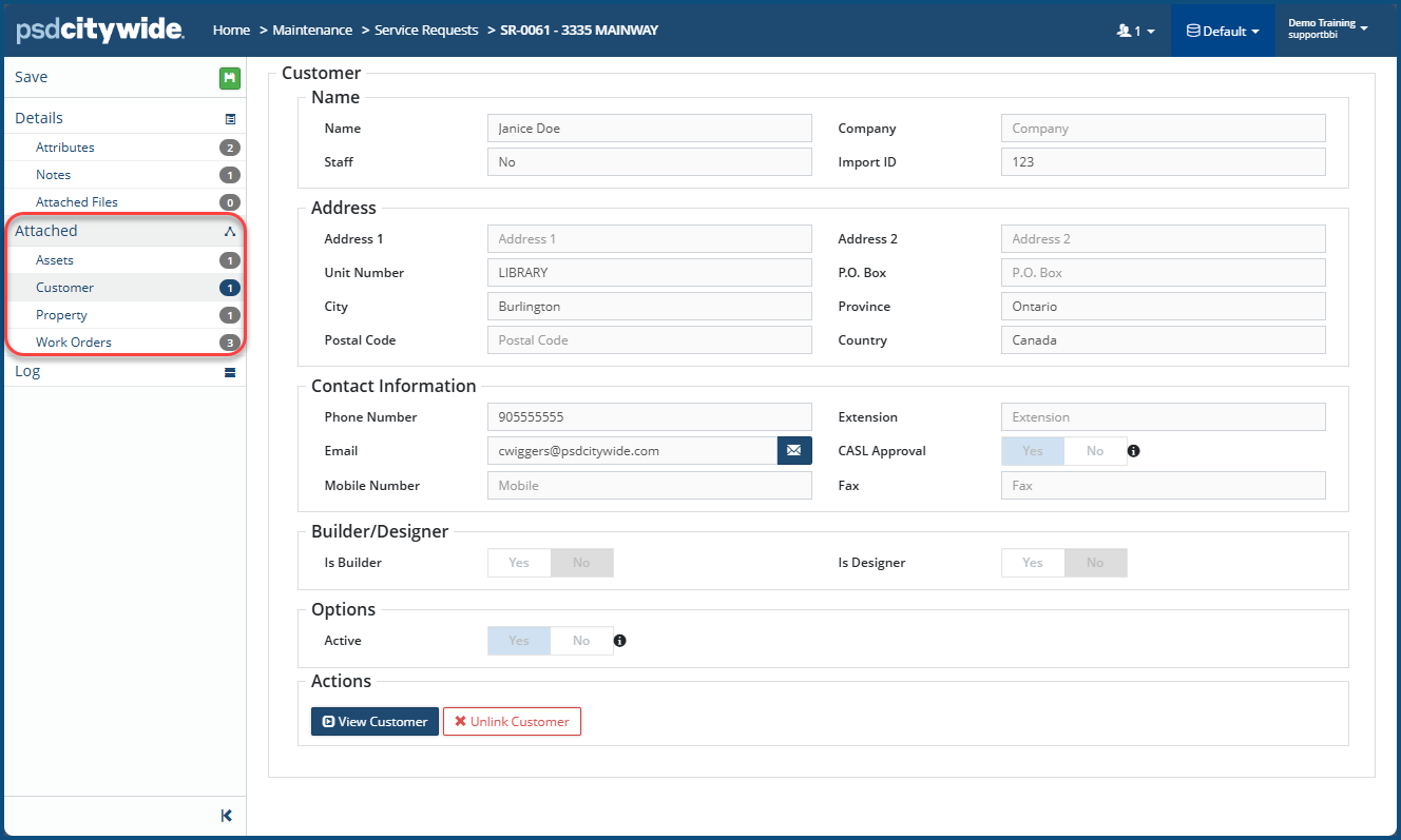Customer details can be viewed on the Customer screen. Users can navigate into the customer profile and/or unlink the customer from the service request.