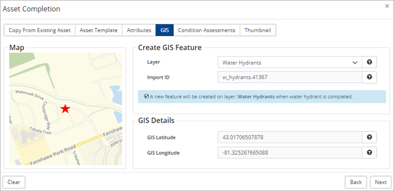 3. Click GIS to view feature and detail information or change the layer this asset will be added to (point features only). A new feature will be created on the selected layer once the details have been completed and saved.