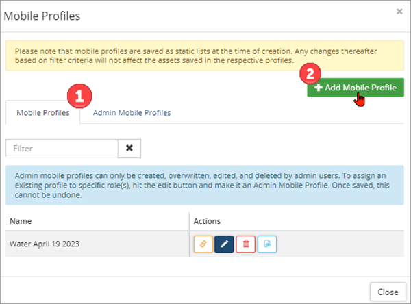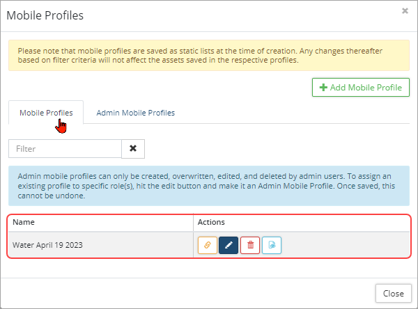 9. Mobile profiles are saved as static lists at the time of creation. Any changes thereafter based on filter criteria will not affect the assets saved in the respective profiles.
