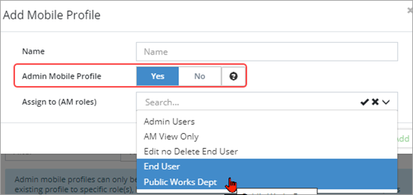 7. If you’re an Assets Admin and you’re creating a mobile profile for others to use, set the Admin Mobile Profile flag to Yes. Select which role(s) can view and download this profile from the Assign to (Assets roles) dropdown (hold Ctrl to multi-select).  Click AddNote: The role needs to have Assets - Mobile view permissions in order to download assets in Citywide Mobile.
