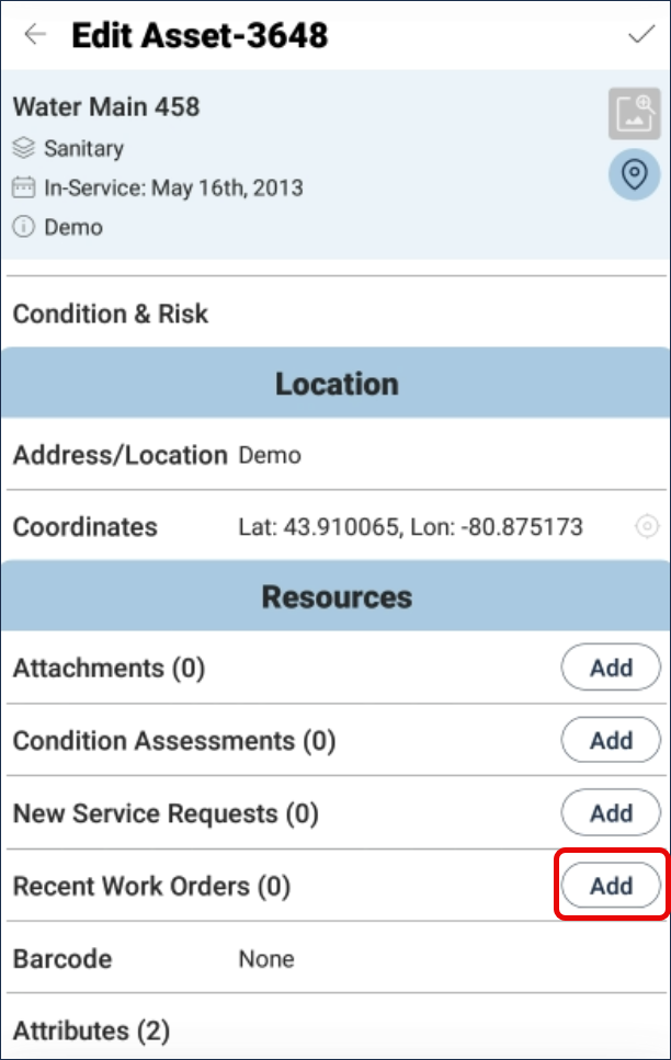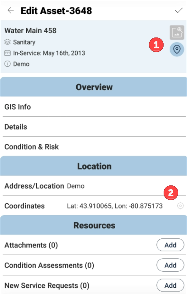 2. Tap the Asset ID to see the asset’s detail and update attributes or add a condition assessment as needed. Tap to save any edits.