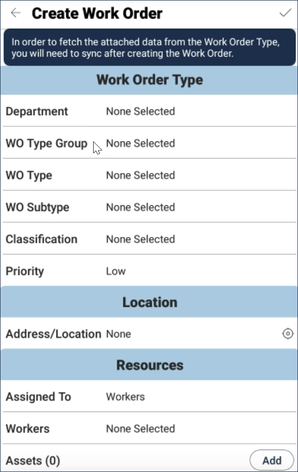 6. Once the new work order has been saved, tap sync at the top to fetch resources data from the work order type.