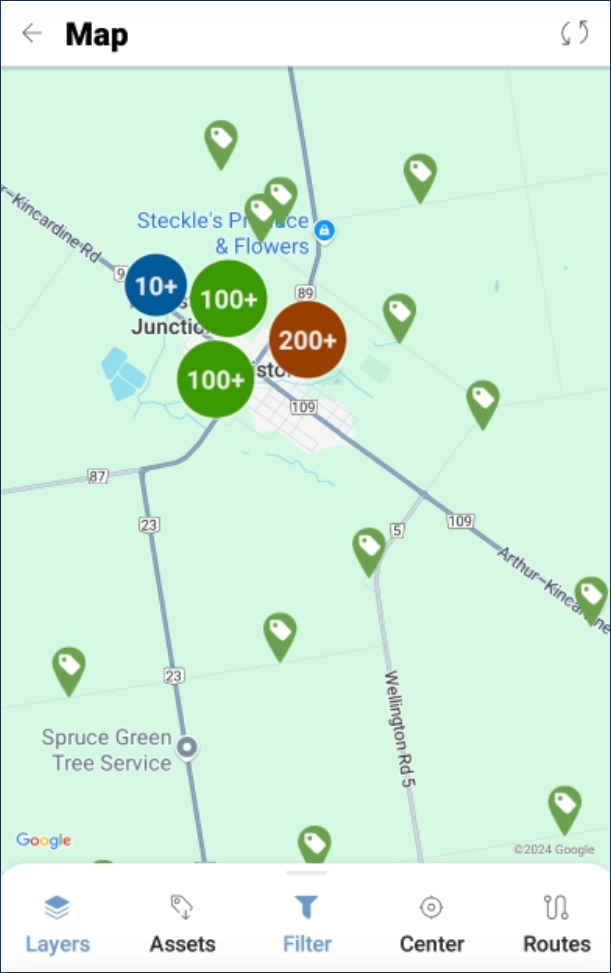 Downloaded assets can be viewed and accessed in Map view.  Assets are identified by individual asset tags or can display in clusters when larger numbers are closely located.
