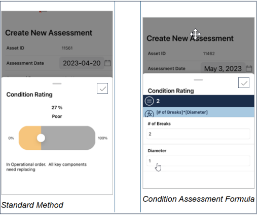 • Condition Assessment Formula: If the asset profile has a formula on it, attributes in the equation are listed for input. Enter a value for each attribute. Condition rating is calculated based on the inputs provided.