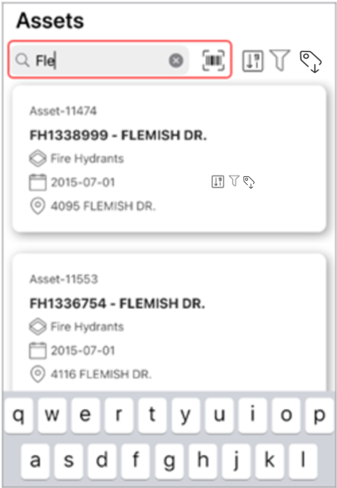 Asset cards display the Asset ID and name, GIS layer if linked, in-service date, and the location for the corresponding asset.  Tap an asset card to navigate to the asset view.